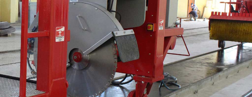 The Wetcut Saw is specifically designed for cutting long/rip cuts through the green hollowcore slabs. The saw cuts directly behind the casting machine in the wet concrete which gives a faster cut than a standard bed saw.